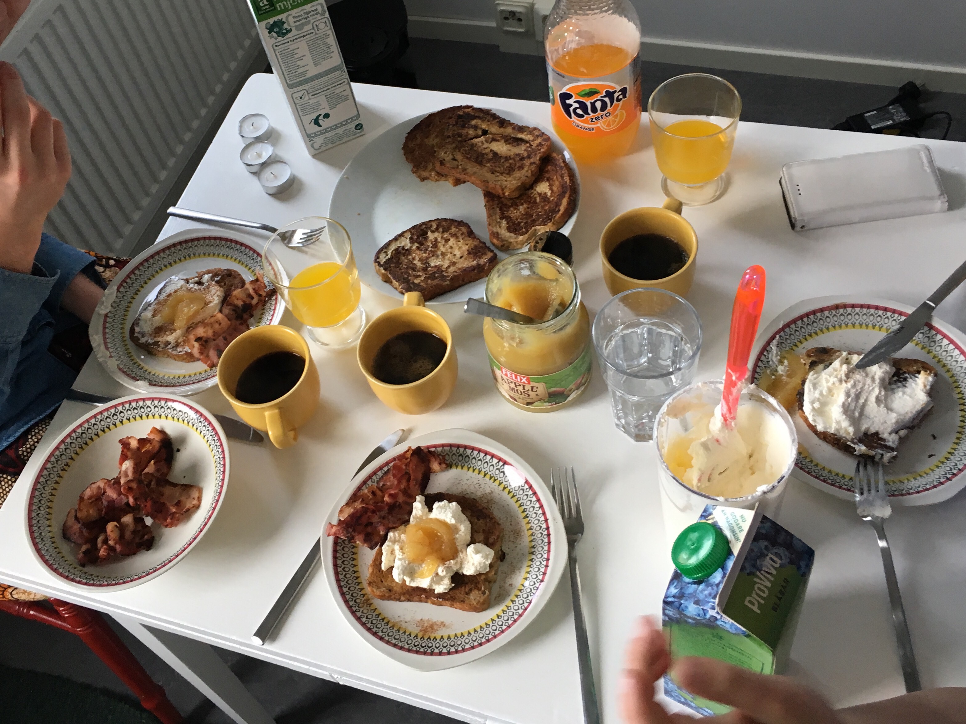 French toasts with bacon, applesauce, cream and cinnamon! Don’t ask me about the Fanta..